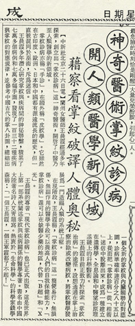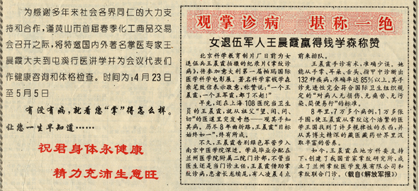 · 1994年2月25日《消费报》刊登“掌纹神医义务就诊”