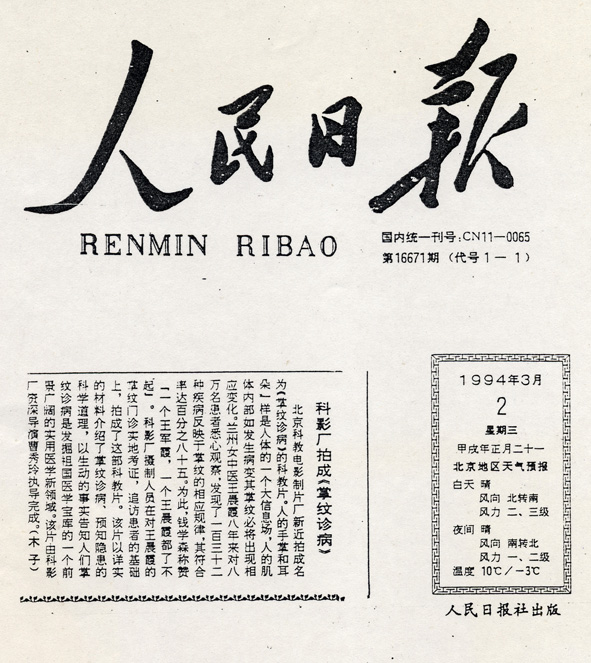 · 1994年3月2日《人民日报》科影厂拍成《掌纹诊病》