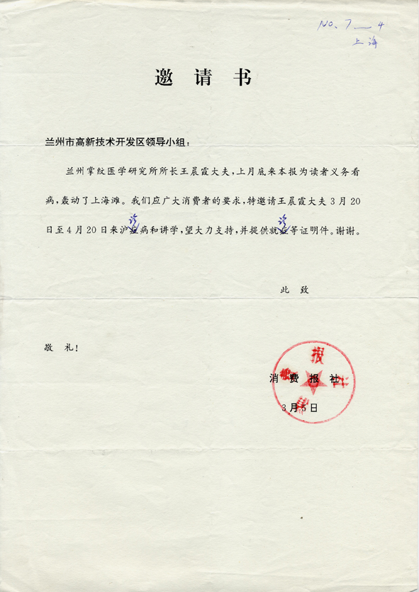 1994年3月21日——4月20日,王晨霞应上海消费报社之邀在上海讲学诊病。