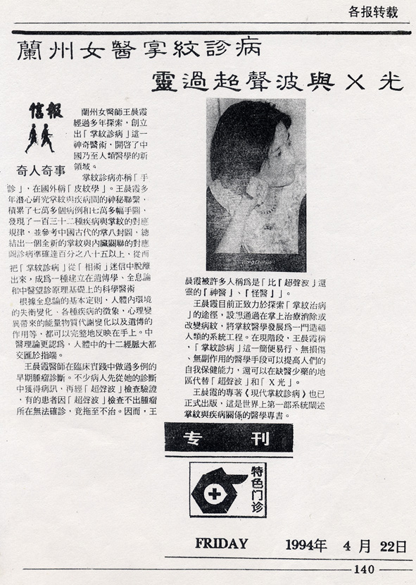 1994年4月22日“兰州女医掌纹诊病灵过超声波与X光”