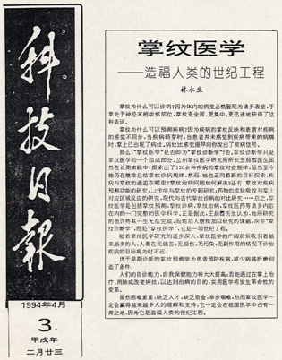 · 1994年2月27日成报“神奇医术掌纹诊病开人类医学新领域”