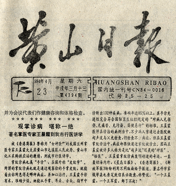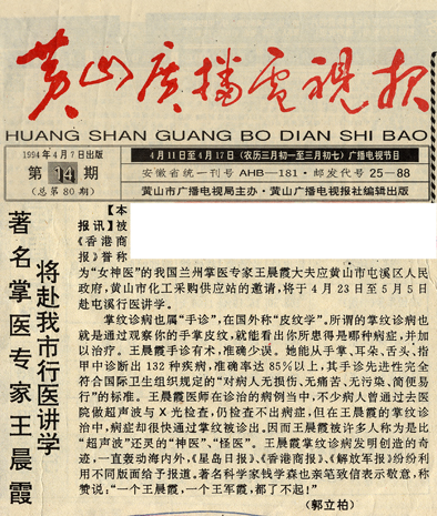 1994年4月7日《黄山广播电视报》第一版“著名掌医专家王晨霞将赴我市行医讲学”