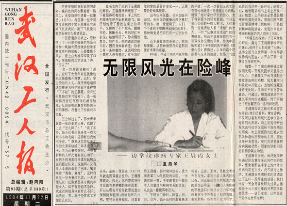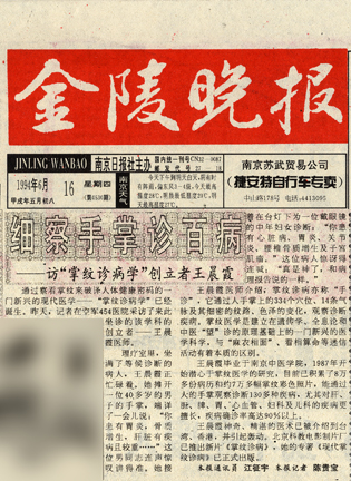 1994年4月5日《东方城乡报》“神医王晨霞再度来泸掌上诊病”上海筹建国际掌纹研究中中心。