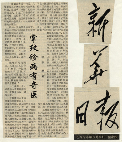 1994年6月9日《新华日报》刊登“掌纹诊病有奇医”