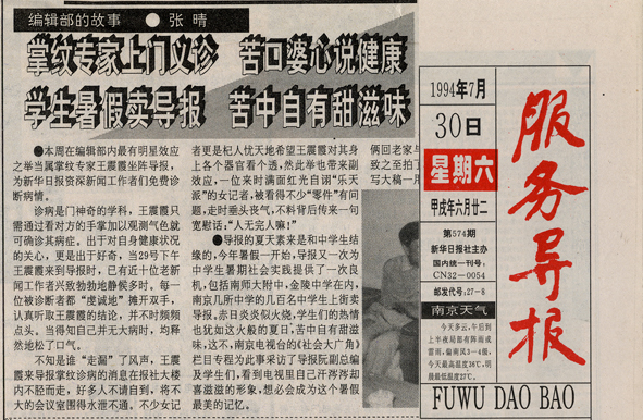1994年7月30日《服务导报》刊登“掌纹专家上门义诊”