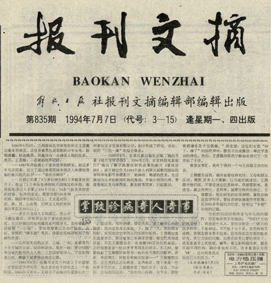 1994年7月7日《报刊文摘》刊登“掌纹诊病奇人奇事”