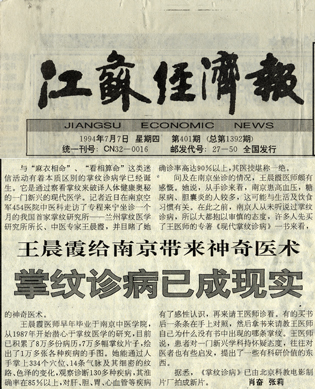 1994年7月7日《江苏经济报》刊登“掌纹诊病已成现实”