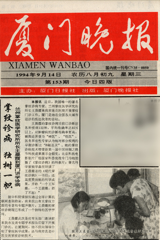 1994年9月15日《厦门日报》刊登“掌纹诊病华夏一绝”