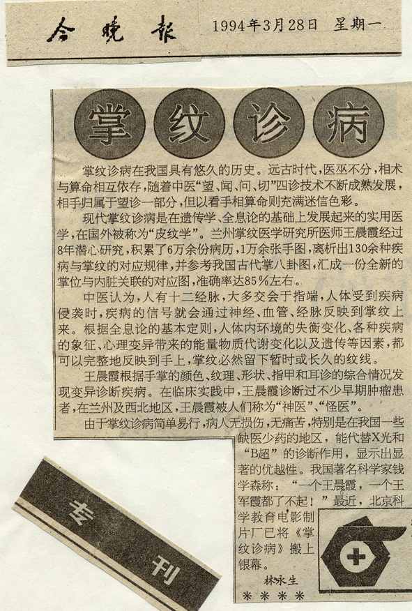 · 1994年3月28《今晚报》掌纹诊病 特色门诊