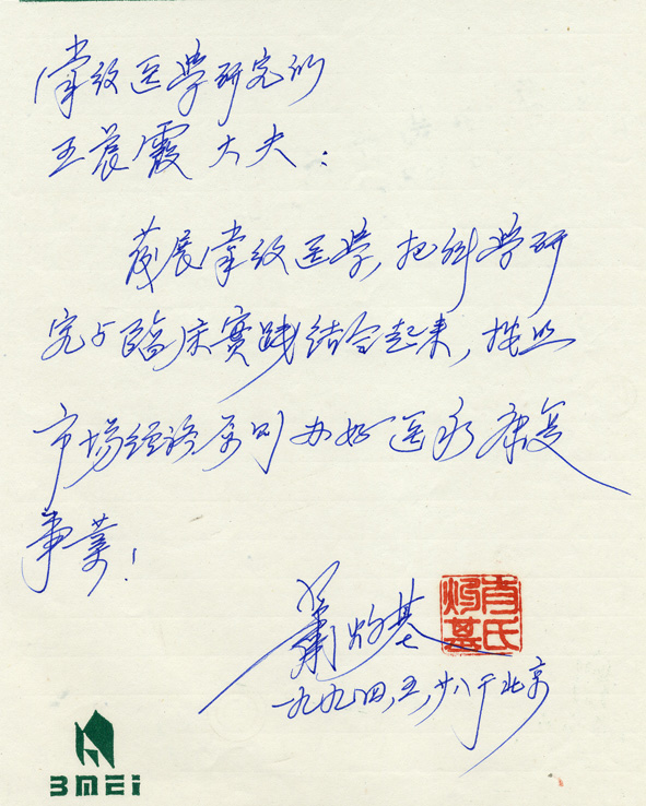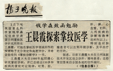 · 1994年2月《扬子晚报》钱学森致函勉励“王晨霞探索掌纹医学”