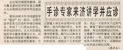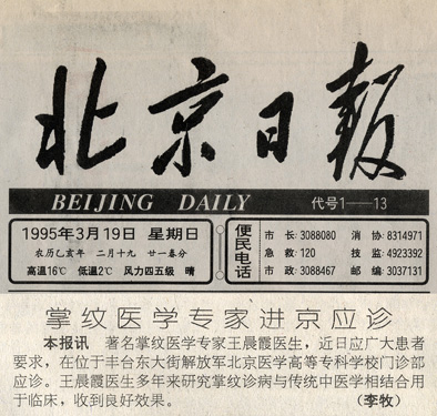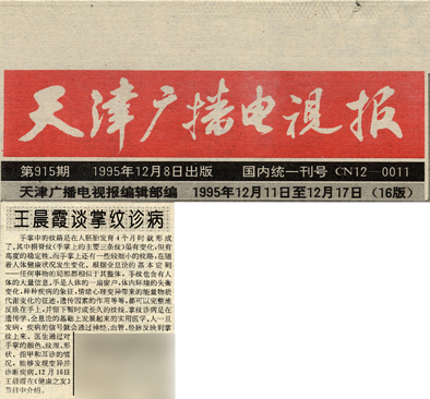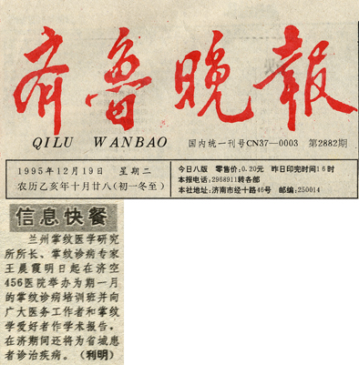 1995年12月19日《齐鲁晚报》刊登“王晨霞所长在济南空军456医院举办为期一月的掌纹诊病培训班并向广大医务工作者和掌纹爱好者作学术报告消息”