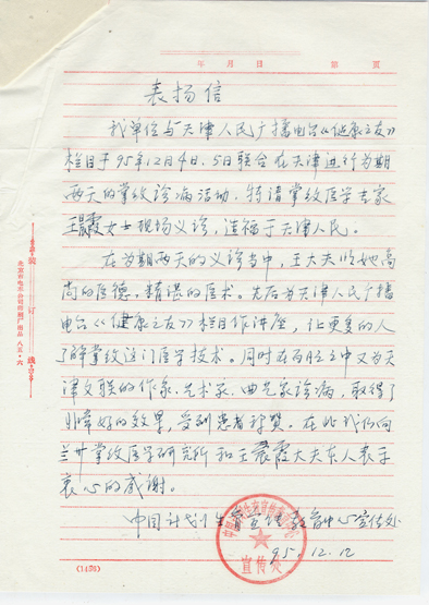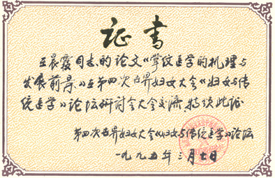 1995年3月7日,在第四次世界妇女大会《妇女与传统医学》论坛上发表论文“掌纹医学的机理及发展前景”