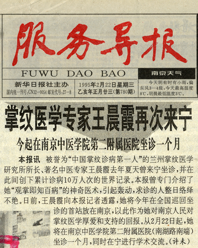 · 1995年2月22日《服务导报》“掌纹医学专家王晨霞再次来宁”
