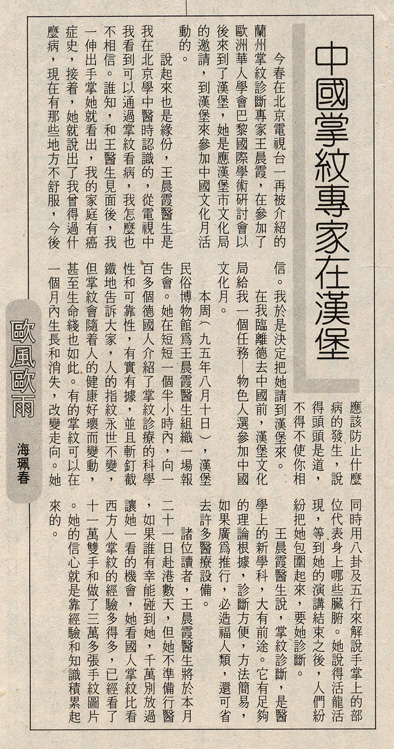 · 1995年8月13日《香港信报》财经新闻第四版报告“中国掌纹专家在汉堡”