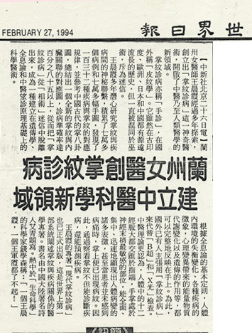 · 1995年9月17日《世界日报》“兰州女医创掌纹诊病建中医科学新领域”
