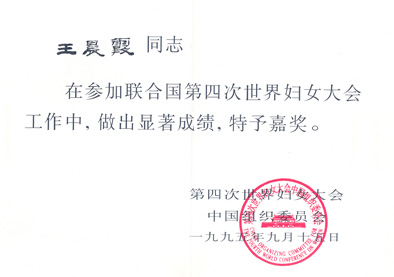 1995年9月15日,王晨霞在参加联合国第四次世界妇女大会工作中,做出显著成绩,荣获嘉奖。