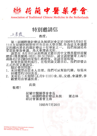 · 1995年7月20日,荷兰中医药学会邀请王晨霞所长参加1996年5月9日至11日在荷兰阿姆斯特丹市自由大学召开的“第二届国际微针疗法系统研讨会”。