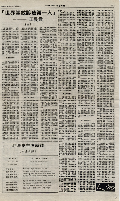 · 1996年10月17日《菲华时报》报道“世界掌纹诊疗第一人——王晨霞”