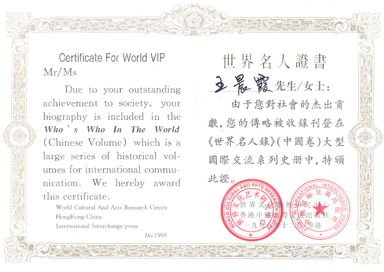 1998年12月,王晨霞所长对社会的杰出贡献被《世界名人录》(中国卷)大型国际交流系列史册收录刊登。