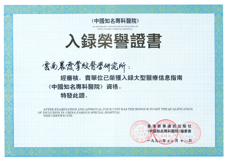1998年12月18日,云南晨霞掌纹医学研究所荣获入录大型医疗信息指南《中国知名专科医院》资格。