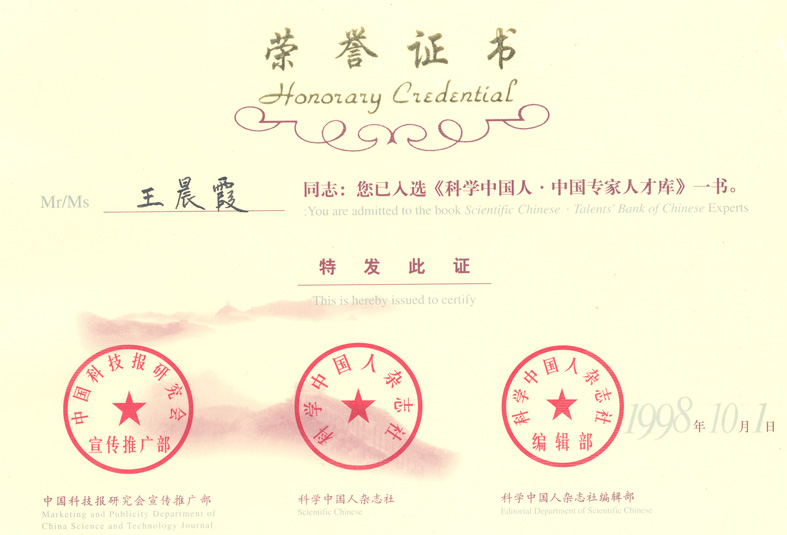 1998年10月1日,王晨霞所长入选《科学中国人? 中国专家人才库》一书。