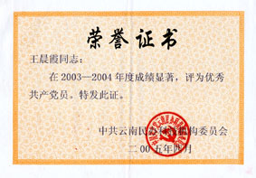 2005年4月,王晨霞所长被“中共云南省科委直属机关委员会”评选为2003年——2004年优秀共产党员。